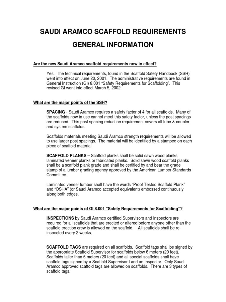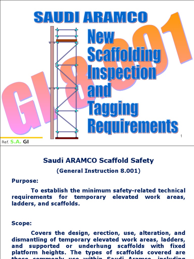 Aramco services jsp14 21 city of novi michigan. Scaffold design erection inspection use alteration and dismantling shall meet the requirements of gi 8001 safety requirements for scaffolds c. Page 1 of 1. Handbook safety minimum safety rules vdj all crane loads shall be rigged by a sa certiped rigger.